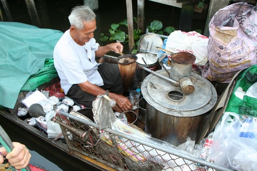 Après un large tour à Bangkok et des improbables rencontres "hommes du monde" comme ce vendeur de café au marché flottant, nous reprenons un trail pour Sukhotai, au Nord Est de la Thaïlande afin de nous acclimater à la région (35° à l'ombre et 90% de taux d'humidité).